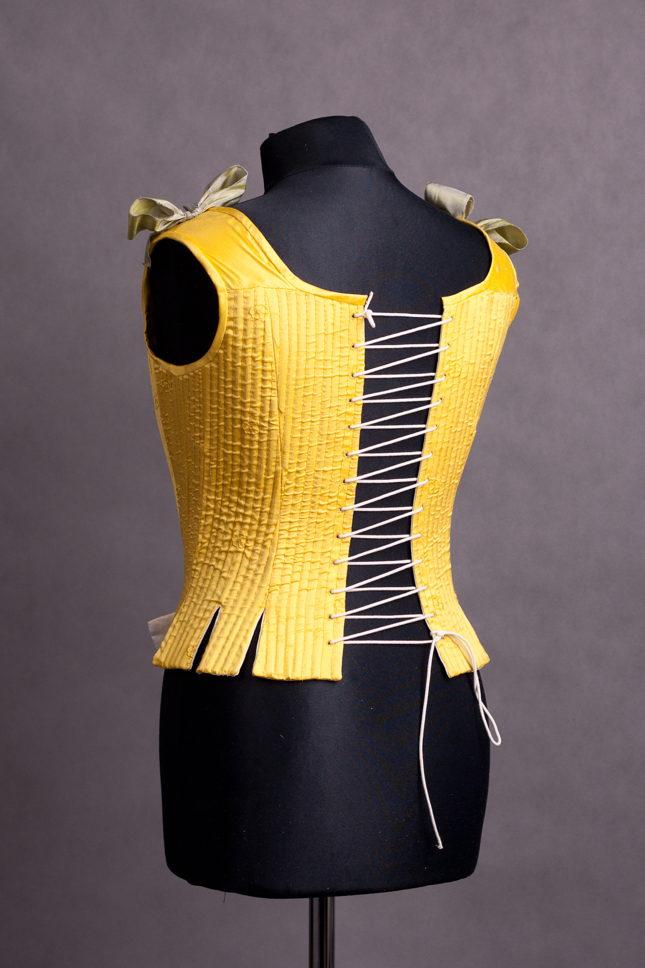 Sznurówka – gorset wykonana została ręcznie, z tkaniny jedwabnej na lnianym podłożeniu. Przód ma sznurowaną, złotą dekorację. Ramiona, dekolt i skraj sznurówki ozdobione są zieloną jedwabna wstążką. Wnętrze gorsetu wypełnione jest w całości wikliną.